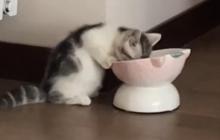 小奶猫太小了,碗太高,吃饭时够不到,它就只能站起来扒着碗吃,这和我吃饭时没有椅子一个姿势。