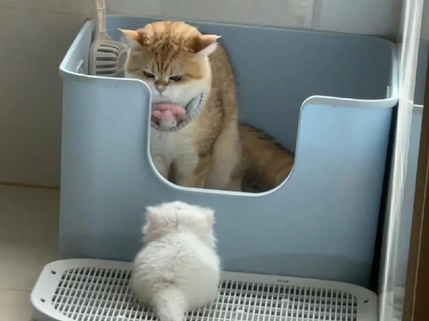 小奶猫没有太早的离开爸爸妈妈,它们会在家长上厕所时去自行观摩,然后学会这项基本的技能。
