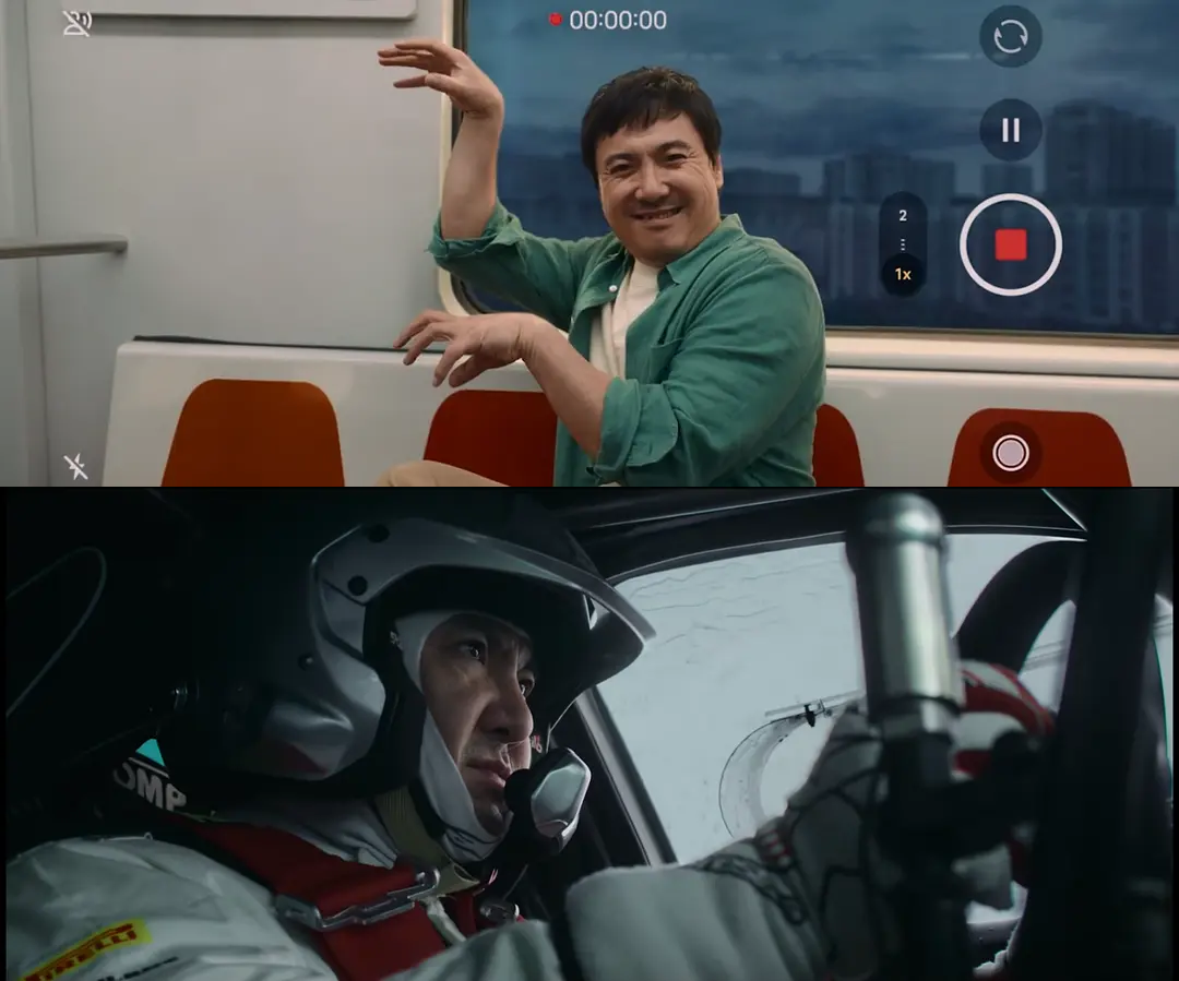 ▲《飞驰人生3》中,赛场外为素不相识的客户录商务祝福视频挣钱的张弛(上)和赛场上力争夺回尊严的张弛(下)。资料图